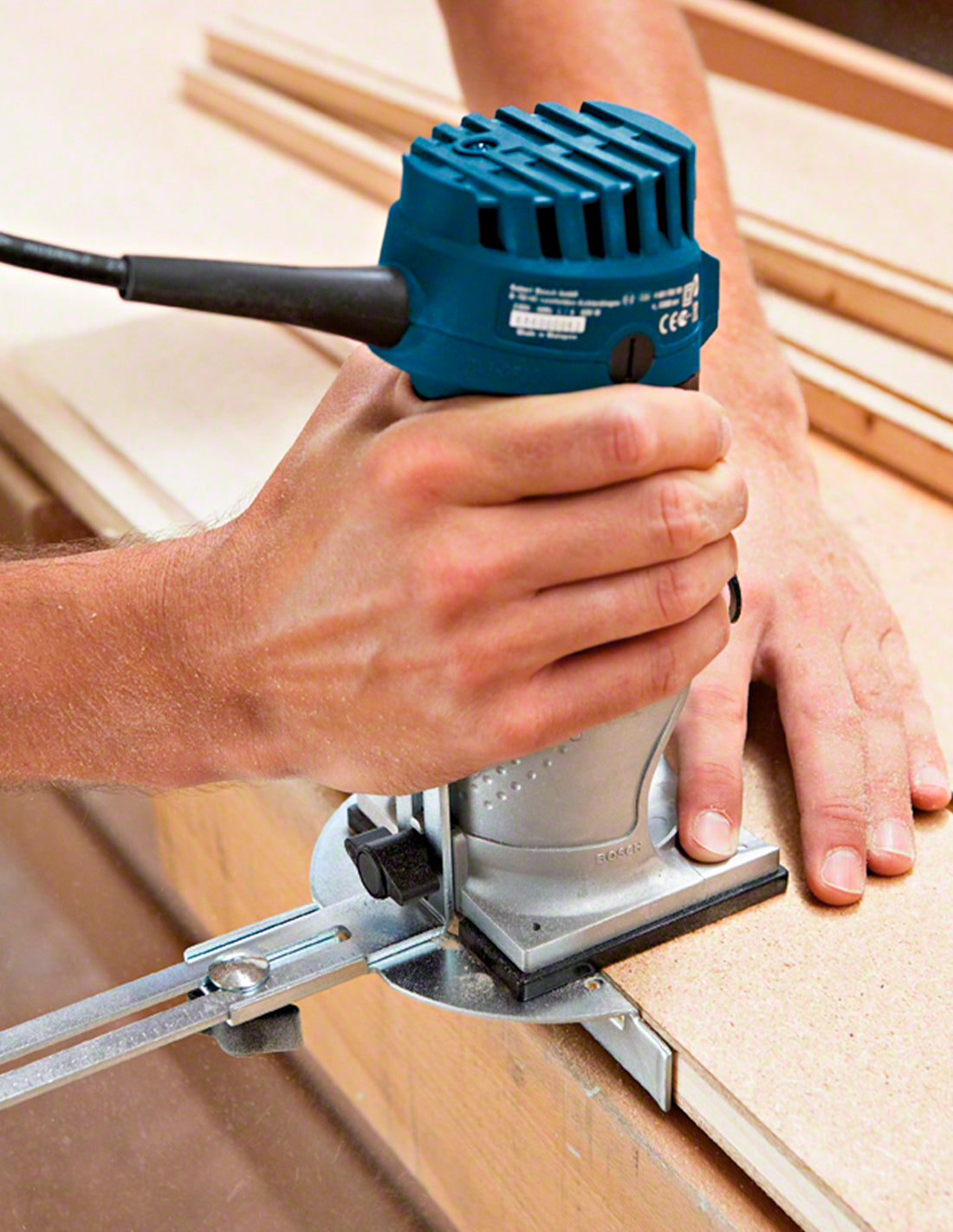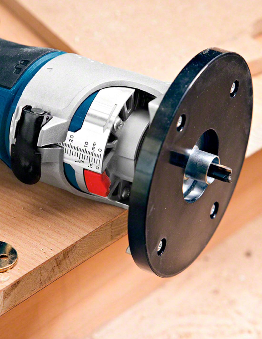 Cet outil est conçu pour le fraisage dans le bois et le plastique. Il est compatible avec les rails de guidage Bosch ainsi qu’avec le système d’aspiration de poussières Click & Clean Bosch.