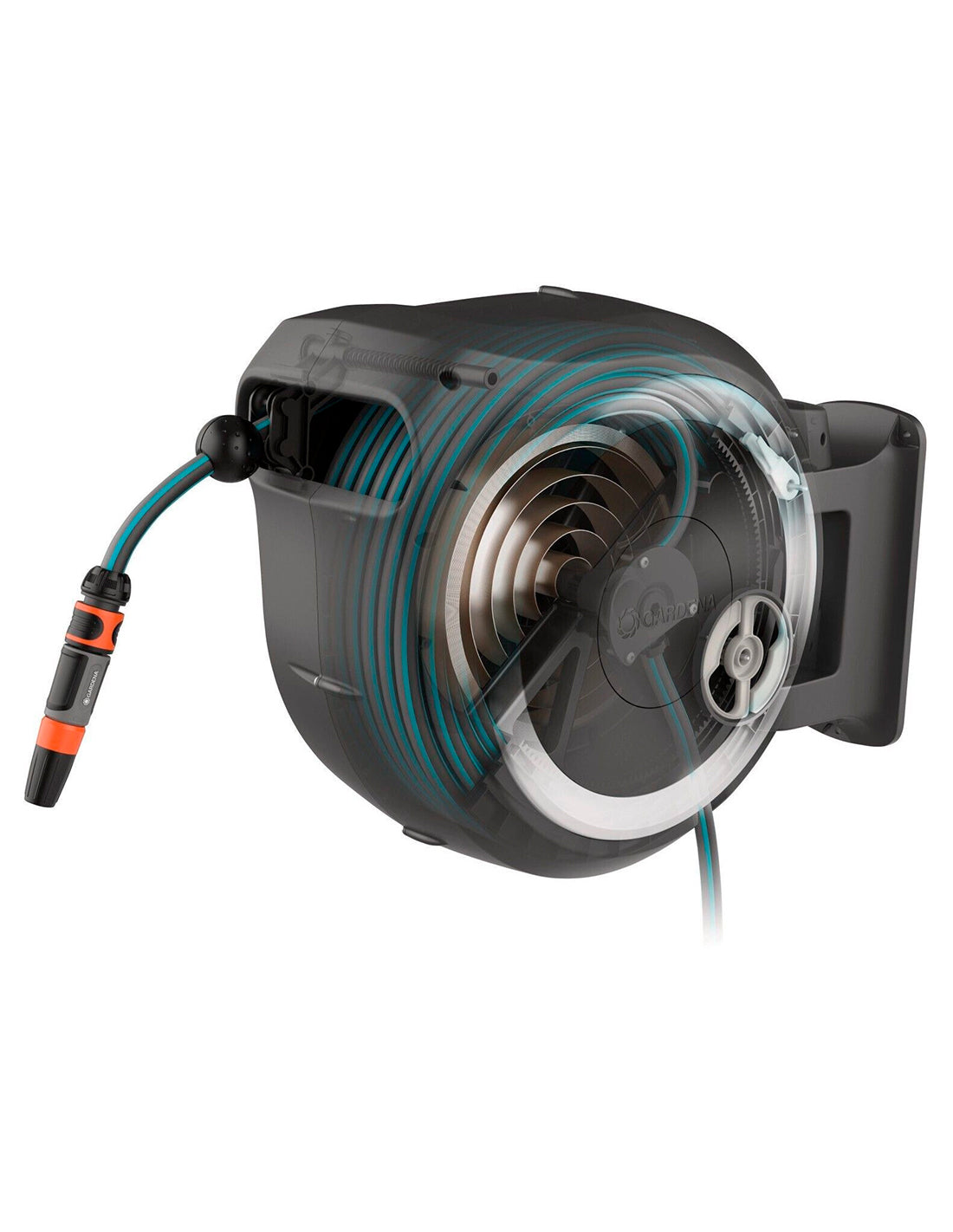 Grâce à la technologie RollControl, le dévidoir automatique mural GARDENA est équipé d’un frein centrifuge, d’un ressort en acier de haute qualité pour un enroulement toujours fiable et homogène du tuyau et d’un guide-tuyau intégré pour éviter les torsions lors de l'enroulement du tuyau.