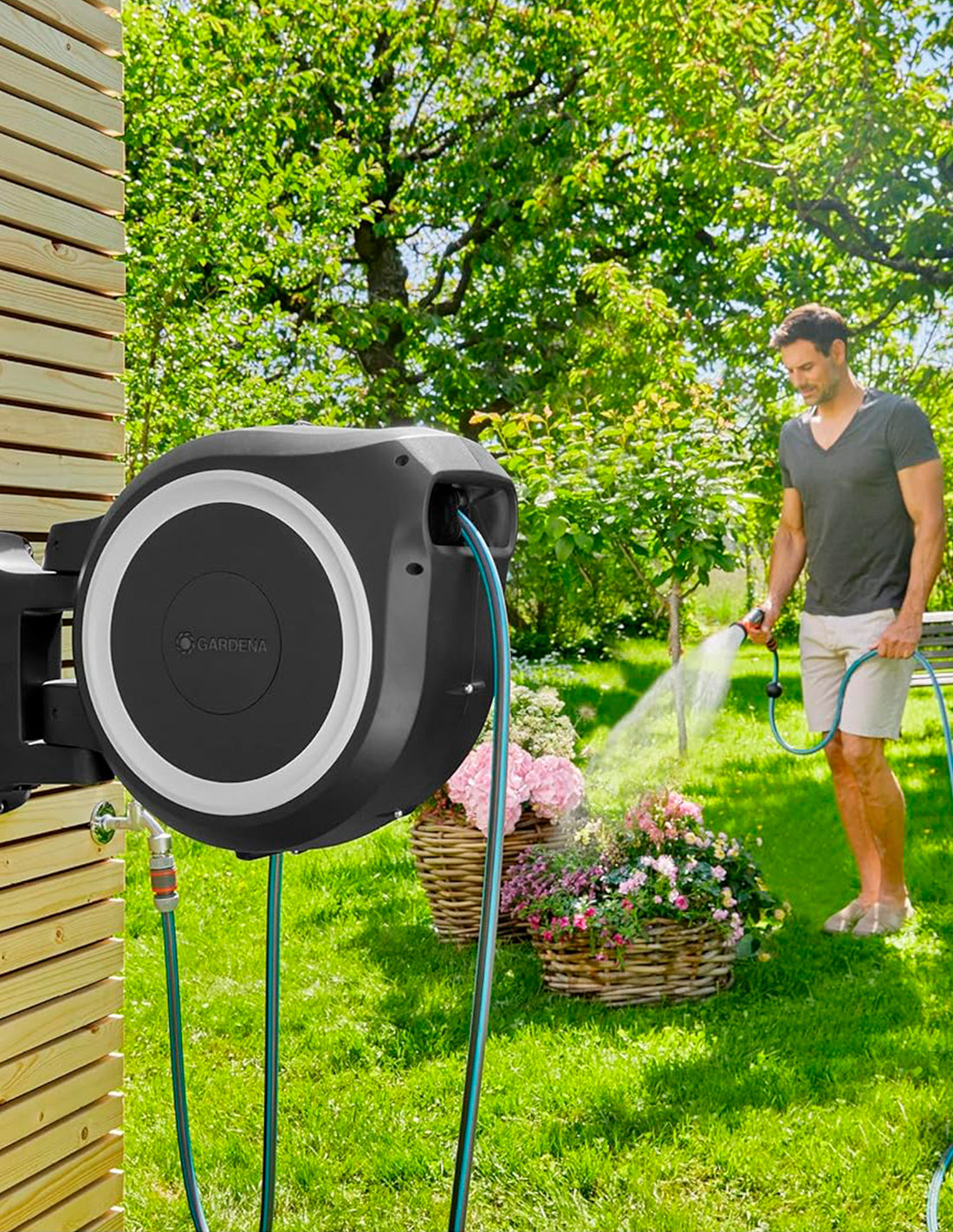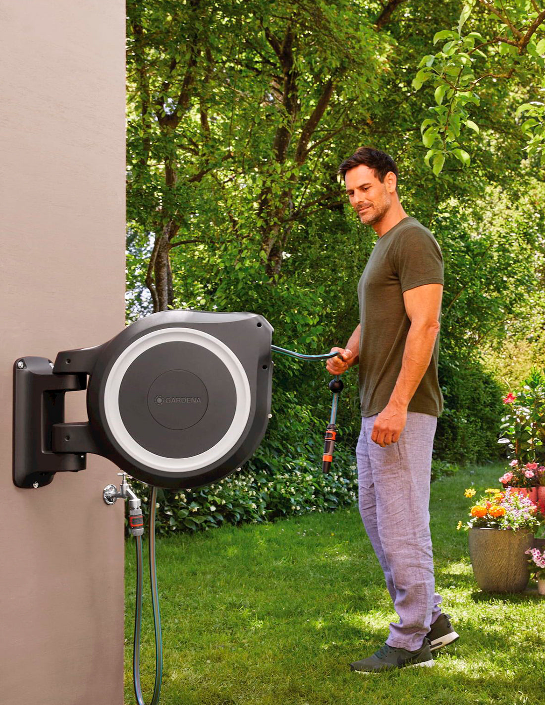 Une fois fixé au mur, le dévidoir automatique et mural GARDENA peut pivoter à plus de 180° afin de pouvoir arroser les moindres recoins du jardin ou de la terrasse. Il suffit de tirer sur le tuyau d’arrosage pour le dérouler puis de le relâcher pour l’enrouler.