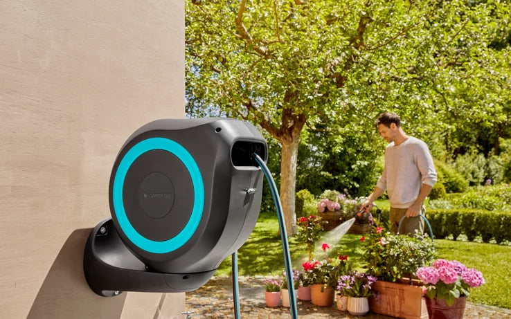 Une fois fixé au mur, le dévidoir automatique et mural GARDENA peut pivoter à plus de 180° afin de pouvoir arroser les moindres recoins du jardin ou de la terrasse. Il suffit de tirer sur le tuyau d’arrosage pour le dérouler puis de le relâcher pour l’enrouler.