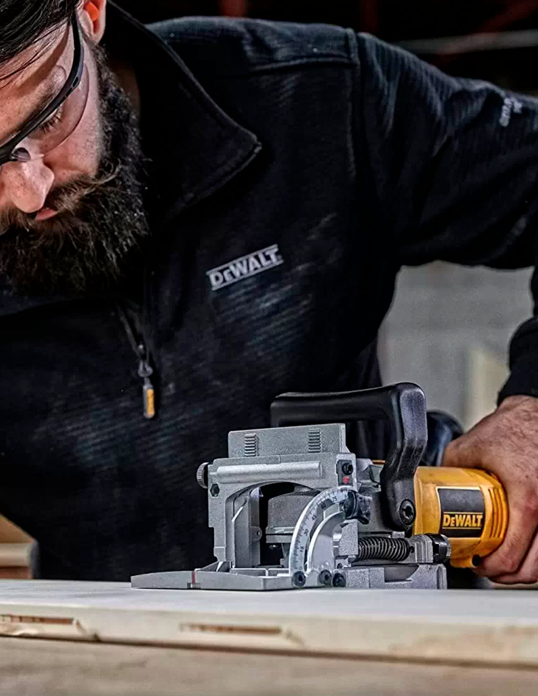 Le kit d’assemblage de plaques DW682K possède un moteur puissant qui permet de travailler les bois durs. Comprend une double crémaillère et un guide à pignon qui assure le parallélisme entre la lame et le guide pour des assemblages précis à chaque fois.