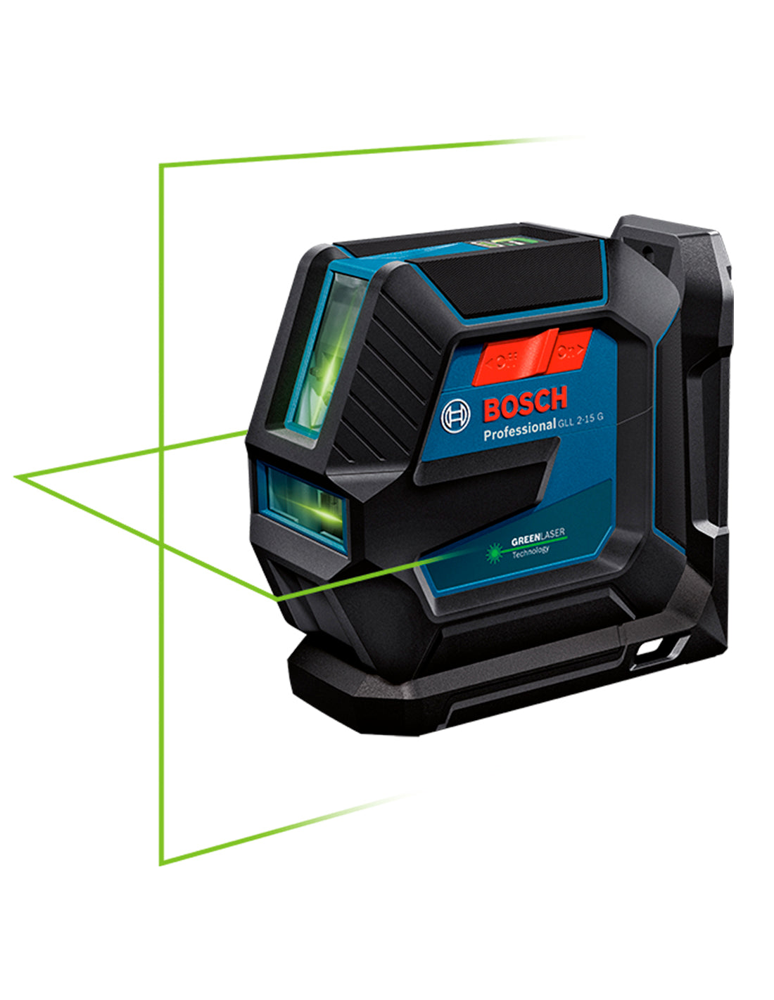 Le laser lignes GLL 2-15 G Professional pour chantiers est la façon simple d’obtenir des résultats précis. La grande robustesse obtenue grâce au boîtier caoutchouté assurant une bonne protection des fenêtres en verre en retrait et la protection contre la poussière et les projections d’eau (IP 64) permettent de rester pleinement concentré sur le travail à effectuer. L’interrupteur Marche/Arrêt et la commande par bouton unique rendent l’utilisation très facile. Les lignes laser verticale et horizontale vertes améliorent la visibilité dans les environnements très lumineux.