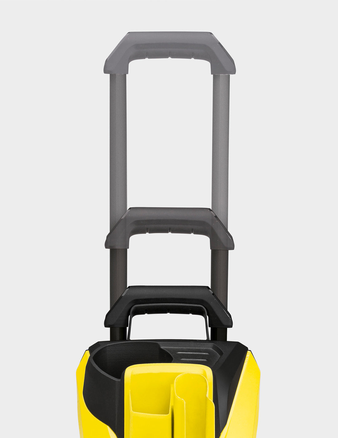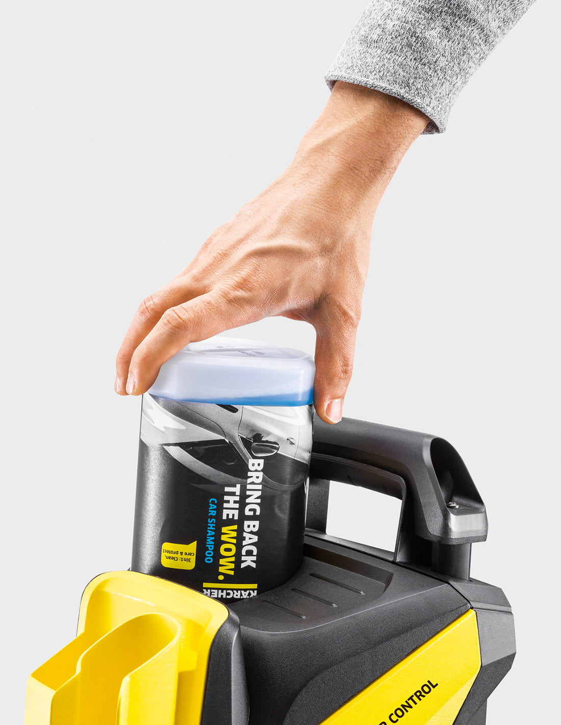 Le K 4 Power Control séduit aussi avec le système de détergent Kärcher Plug ’n’ Clean pour un remplacement sans peine du détergent, une poignée télescopique pour un transport aisé ainsi qu'une position de stationnement pour des accessoires à tout moment à portée de main.
