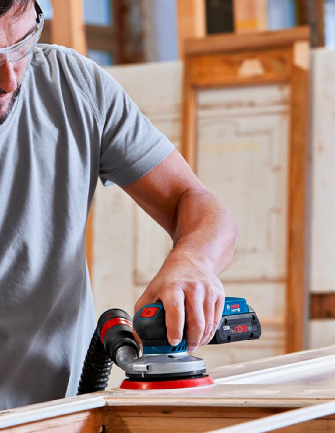 Cette ponceuse excentrique sans-fil est conçue pour les travaux de ponçage de base, les ponçages intermédiaires, pour l’enlèvement de laques et vernis et la finition de surfaces. Elle est utilisable sur le bois, le bois plaqué, les laques et vernis, le mastic, les matières minérales et acryliques. Elle est compatible avec le Professional 18V System et avec le système d’aspiration Click & Clean Bosch. Également compatible avec AMPShare, l’alliance batteries multimarques.