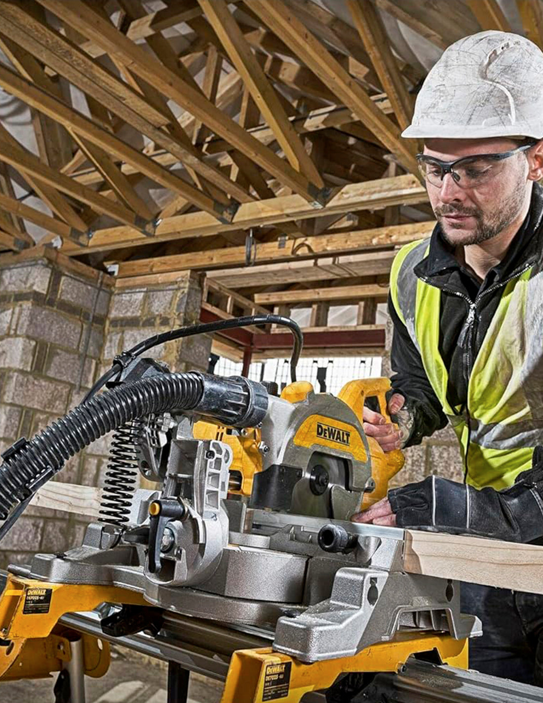 La scie à onglets radiale DEWALT DWS777 est entièrement compatible avec tous nos systèmes d'aspiration de poussière et ceux de nos concurrents. Compatible avec le système AirLock™ et les sacs à poussière, elle vous offre une plus grande flexibilité lors de son utilisation sur site.