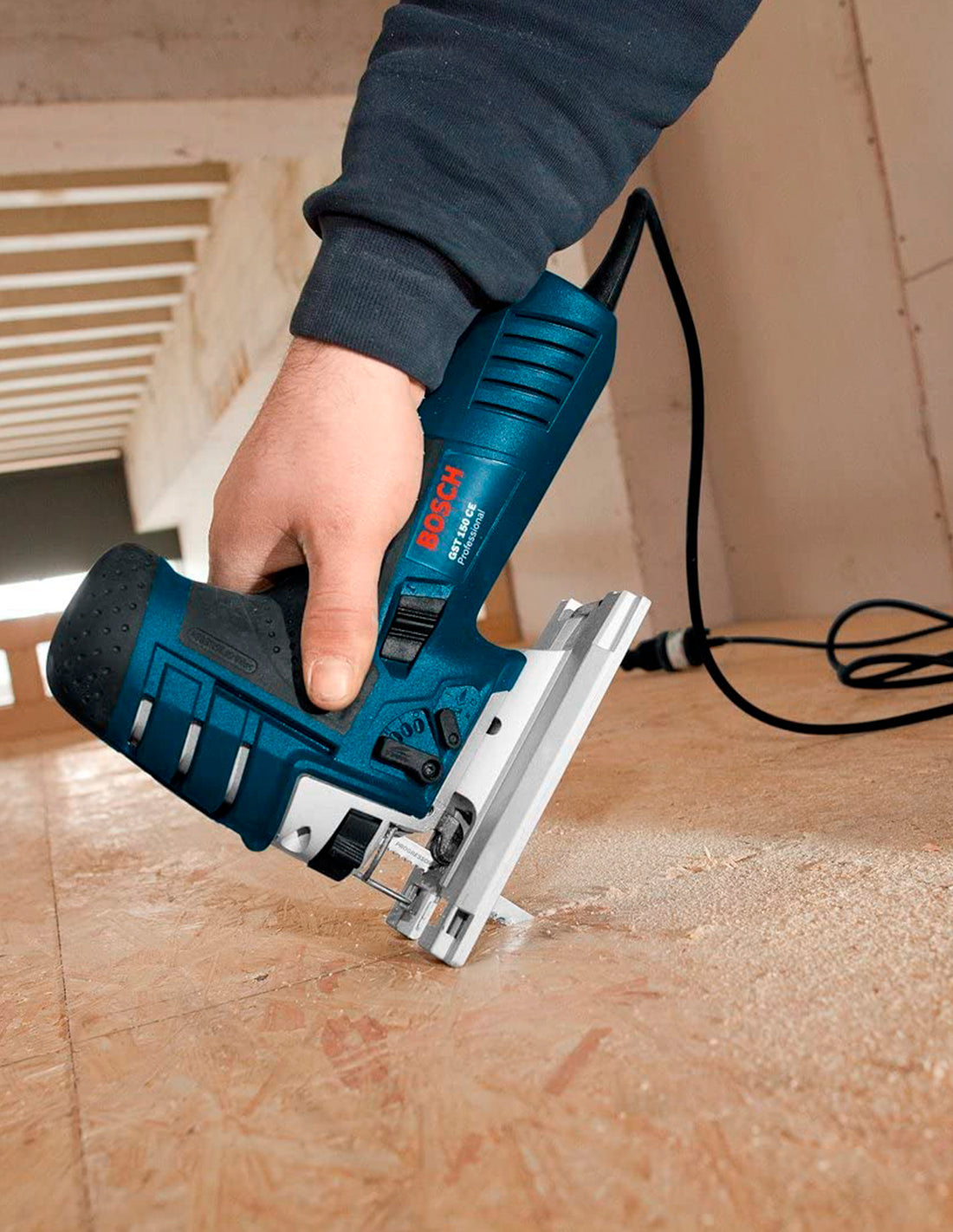 La GST 150 CE Professional permet aussi d’effectuer des coupes biaises et dispose d’une soufflerie, d’un mouvement orbital, d’un système de changement de lame SDS sans clé et d’une présélection de vitesse.