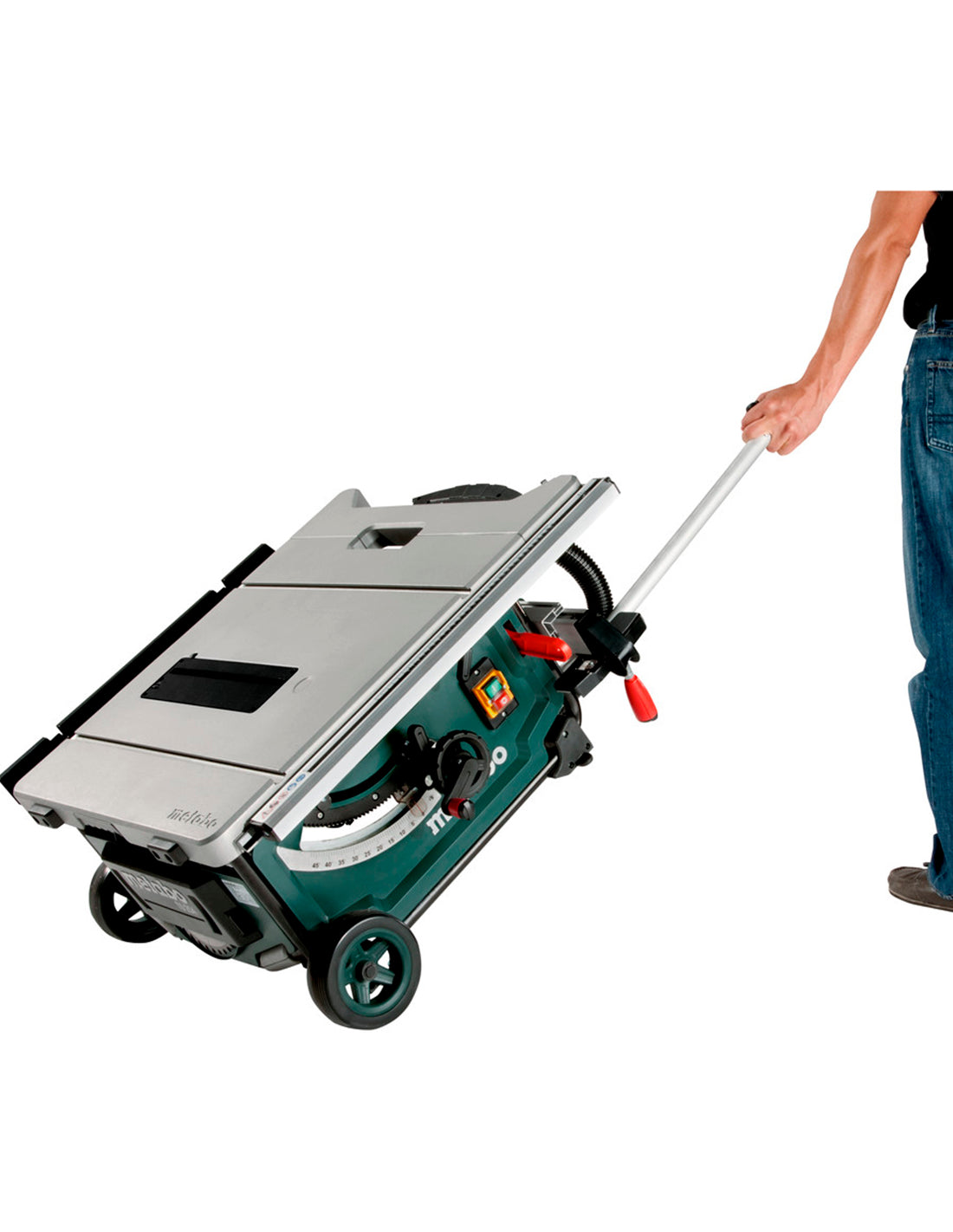 Scie circulaire de table extrêmement légère avec fonction trolley pour plus de mobilité sur le chantier. Socle intégré en fonte d'aluminium moulée sous pression (en cours de brevetage) : se déplie en quelques secondes, très stable. Très compacte avec pieds rabattus pour un transport confortable et un rangement peu encombrant. Deux hauteurs de travail pour le sciage à même le sol. Structure rigide en tubes d'acier pour résister aux sollicitations élevées sur le chantier et durant le montage. Le câble et toutes les pièces rapportées peuvent être rangées sur la machine pour le transport. Moteur à entraînement puissant et protection électronique contre la surcharge. Frein moteur pour l'arrêt rapide de la lame de scie en 3 secondes. Protection anti-redémarrage : empêche tout démarrage involontaire après une coupure de courant. Démarrage progressif pour une longue durée de vie du moteur et du réducteur. Guide latéral précis avec double serrage et fixation rapide. Inclinaison précise de la lame de scie grâce au guide à couronne dentée. Remise automatique à l'état initial 0-45° après une contredépouille. Changement de lame facile grâce au blocage de la broche. Couteau diviseur abaissable sans outil pour le transport. Extension latérale et rallonge de table précises et coulissantes pour une surface de travail particulièrement grande.